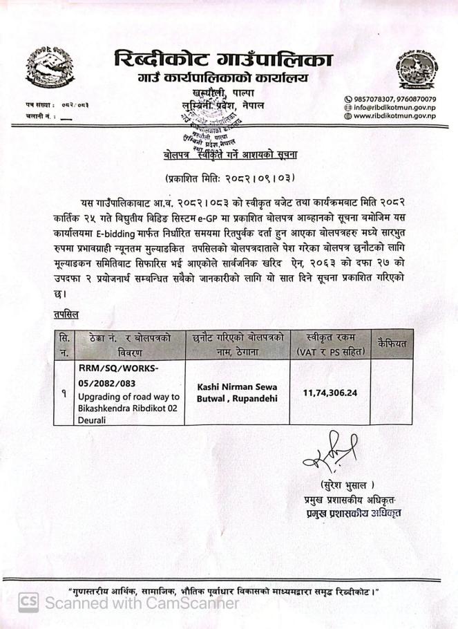 बोलपत्र स्वीकृत गर्ने आशयको सूचना