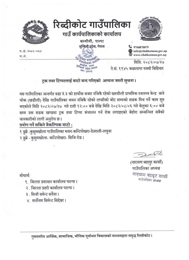 ट्रक तथा टिप्परलाई बाटो बन्द गरिएको अत्यन्त जरुरी सुचना