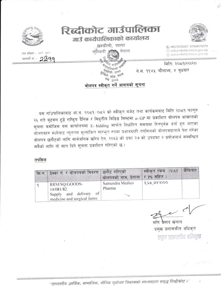 बोलपत्र स्वीकृत गर्ने आशयको सूचना