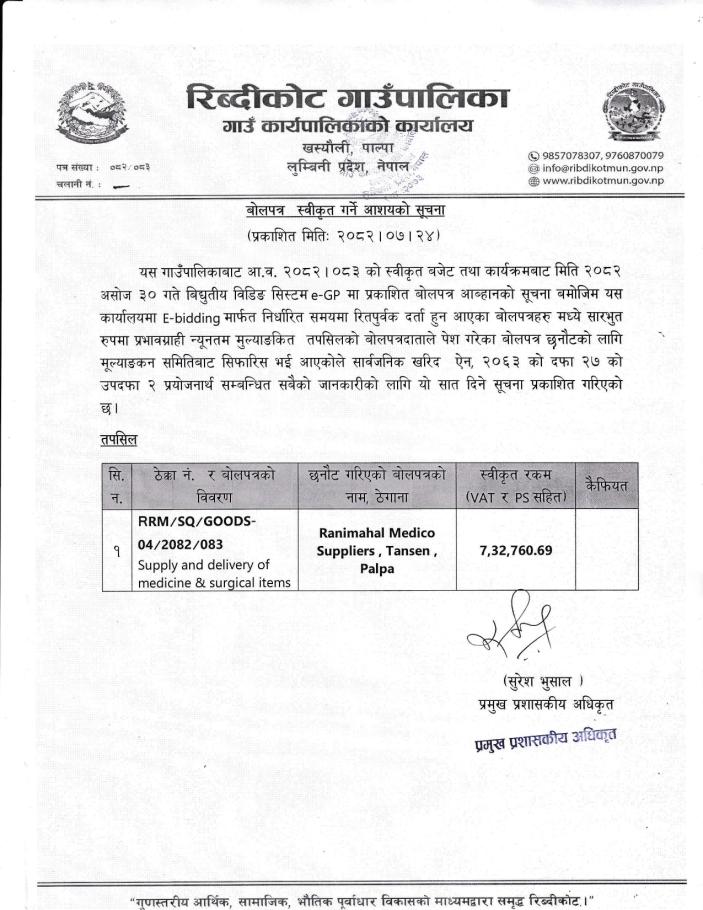 » बोलपत्र स्वीकृत गर्ने आशयको सूचना