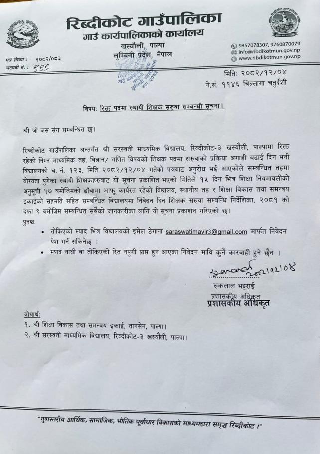 » रिक्त पदमा स्थायी शिक्षक पदपुर्ती सम्वन्धी सूचना
